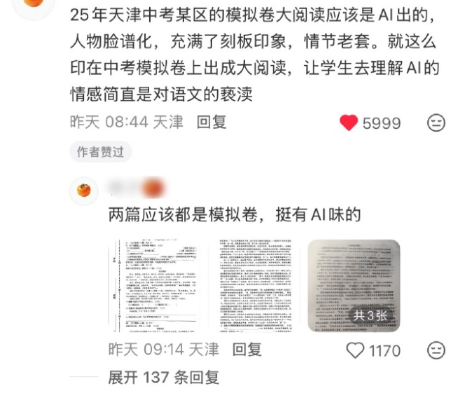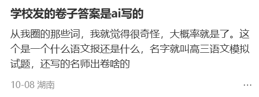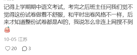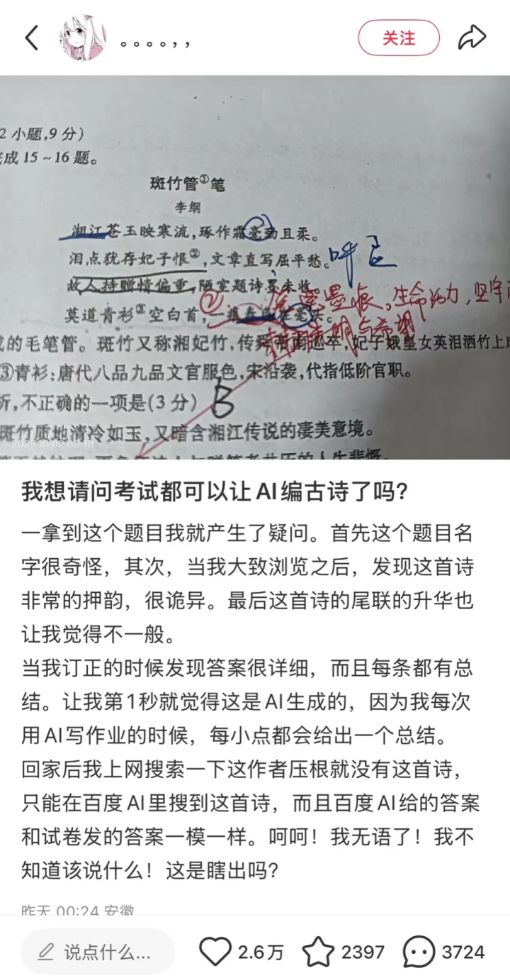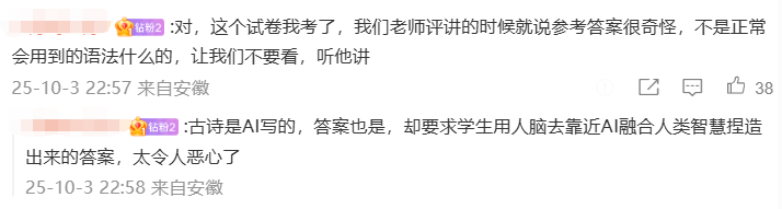 难怪有人质疑,“既然AI都能自己出题自己答了,还要老师干什么?” 如果抛开别的因素,单纯从创作角度上看,AI能写出这样的内容,或许让人惊喜。 但核心问题没法抛开。 首要问题是,试卷将作品定性为唐诗/宋诗,又张冠李戴搞错了作者,属于事实性错误。 对出题人来说,这是教学工作的严重失职啊。 如果连知识本身都是错的,那么学生又能从中学到什么呢?学习AI的“思想“吗? 更严重的是,教师直接用AI来生成题目,完全违背了教育测量学的基本原理。 即通过考试等测量手段,来对学生们的学习进度和水平进行量化。 语文考试的目的,原本是考察学生对文本的解读和分析能力。做古诗词赏析,往往还要结合作者生平和时代背景一起分析。 可是。 你能对着一首AI虚构的诗分析什么呢? 分析它背后的代码到底怎样运转? 还是分析它接收了怎样的生成词? 结果是,大家只能对着几行文字,分析“出题人”的意图,揣测对方希望得到怎样的答案。 这考的不是知识,是读心术啊。 原本就有声音说,很多阅读理解题都是牵强符合,连作者本人看了答案都会摇头,那么这种由AI自导自演的题目就很荒谬了。 当学生不得不对着AI创造的拼贴诗文,大谈深刻思想或离愁别绪的时候,教育也就沦为了一种彻头彻尾的教条主义。 现在总有人觉得语文课上了没有用,呼吁要取消语文学科,感觉这样滥用AI只会进一步助长这种声音,导致更多人觉得这门课可有可无。 于是时间长了,你就发现网上越来越多听不懂别人说话的人,你说城门楼子他说胯骨轴子,大家鸡同鸭讲,永远沟通不到一起去。 相关话题下,有老师表示无奈。 他们说,现在任务太多了。不光要负责上课,还要搞学术、写论文、听培训、忙比赛,偶尔还要出门扫大街,常常感觉教书是副业。 偏偏很多学校还会强制要求老师搞创新,上课、出题不让照搬以前的,得改。 所以能够快速生成大量题目的AI就派上用场了,比自己费劲吧啦苦思冥想半天有效得多。 结果,题目不仅创新,还创新过头了。 但是,因为忙不过来、创新不够,就全全放手给AI,显然是偷懒的,不负责任的做法。 今年5月,教育部出台的《中小学生成式人工智能使用指南(2025年版)》中,明确规定“教师不得将生成式人工智能作为替代性教学主体,禁止直接使用AI回答学生问题或提供咨询。” 还禁止教师直接使用AI生成内容评价学生,严禁将考试试题等敏感数据输入AI工具。