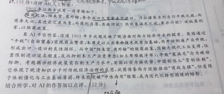 但明明就有好的示范啊。 同样是用AI出题,有的试卷换了一种方式,把AI给的答案放进题目,让学生进行点评。