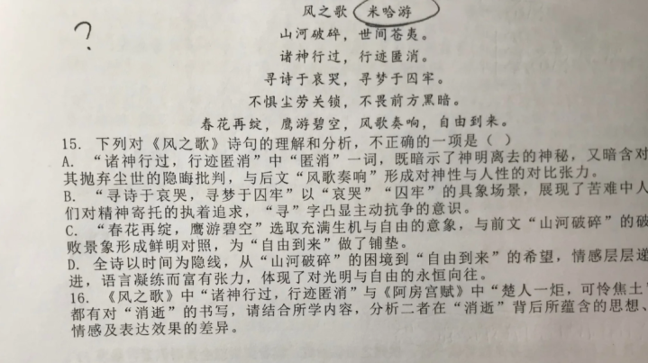 同样是在古诗词范畴内,查无此诗。 唯一能查到的那位历史上有记载的那位王晦之,还是个北魏人啊。 相关工作人员给出的解释是,这首诗的来源是某位研究生导师的讲课稿,采用了唐诗风格,确实是原创,但大家依旧持怀疑态度。 与此同时,米哈游的大作也登上了试卷。 不是原神,而是古诗。 恐怕米哈游也没有想到,自己会以这样的方式被广大师生们看见。