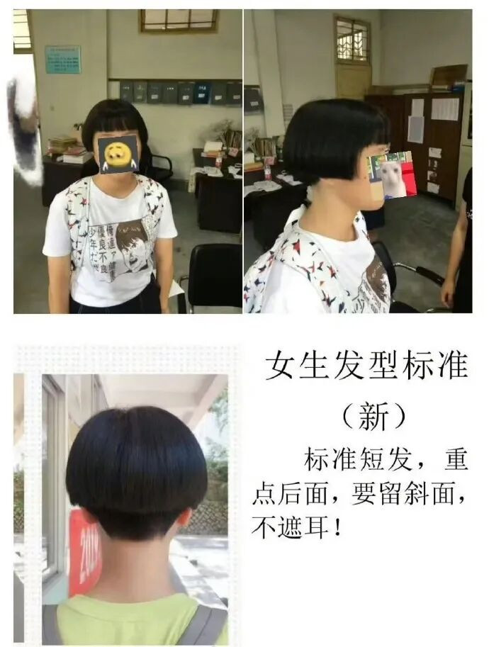 有这些正向的模式可以效仿,学校们老师们又为何非要用那些偷懒的方式呢? 如果每个老师都这样偷懒,那以后教育岂不是会变成:老师们AI出题,学生们用AI答题,老师们再用AI批改,老生们背诵AI给的答案。 一切都是AI的载体,人从教育中消失了。 这让我又想起以前的一条新闻。 说福建有个中学,一入学就强制要求给学生们剪头发,标准还特别严格。 不能挡住耳朵是基础要求,头发后面要形成一个明显的梯形,呈明显的45°斜坡状。