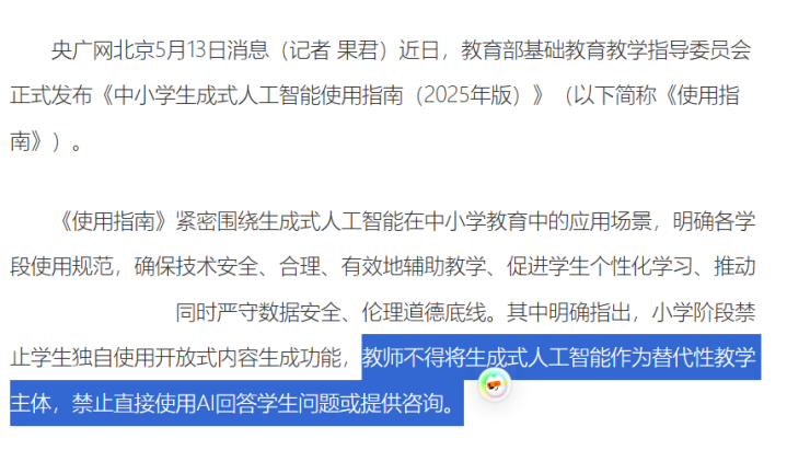 这很好理解。 因为老师的专业职责之一,就是保证教学内容的准确性和适应性。你把这些都抛给AI,还不去做二次审核,谁能保证没问题呢? 还有老师爆料,现在很多地方都在喊“AI赋能教育/教学”的口号,四处都在开类似的培训会,逼着老师们去学习和使用。 虽然它主要的观点是通过AI辅助改变教学方式,减轻教师负担,但是经过层层转述,最后落地到实践中就完全变了味。 有些学校,没有悟性,就搞出了“用AI节省人力成本出题/做课件”这一套。 把路给走偏了。